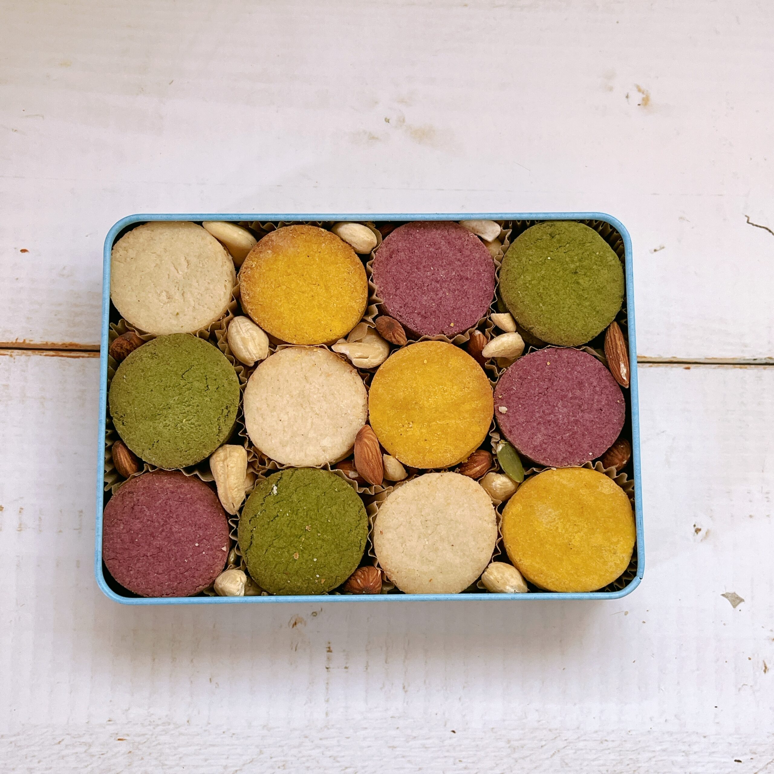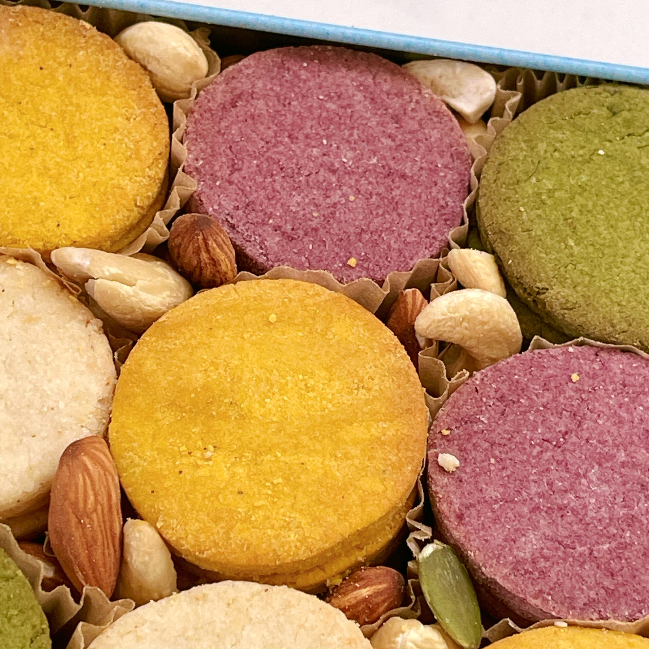 国産米粉に、有機アーモンドパウダーと、種子島産きび砂糖そして、北海道産かぼちゃや、鹿児島産紫芋に有機抹茶など4種類の米粉クッキーと有機ナッツを敷き詰めました